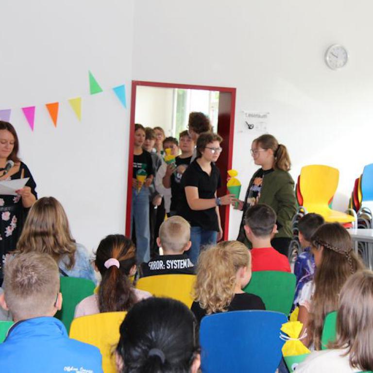 Jetzt gehe es aber erst einmal darum, sich vertraut mit allem Neuen an der Schule zu machen. Und was das so ist - das präsentierten die Sechstklässler mit einem lustigen und gekonnt vorgetragenen Gedicht, an dessen Ende sie die Neuen mit bunten Buchstaben willkommen hießen.