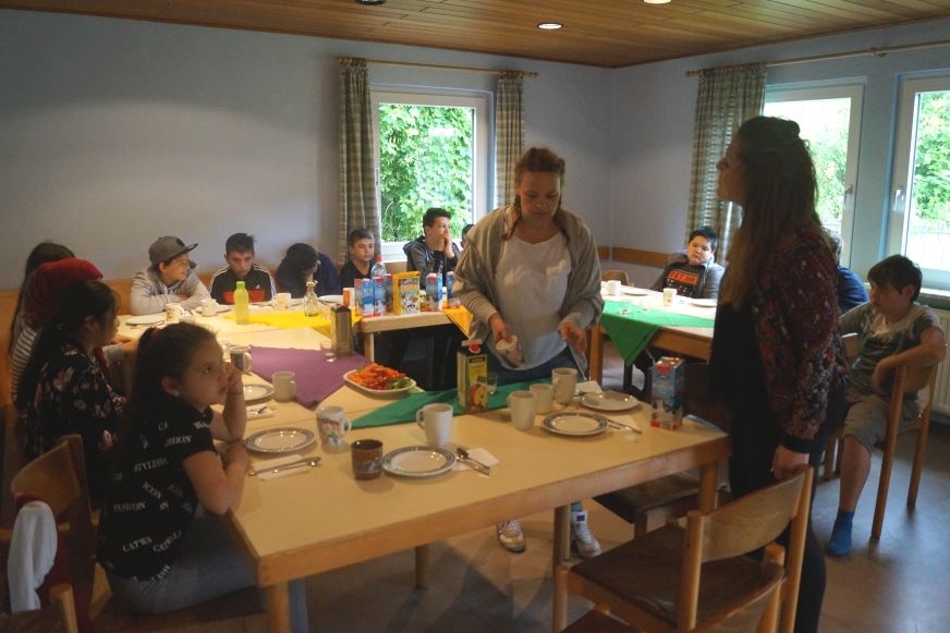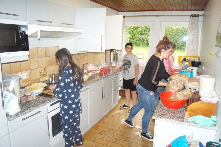 Zum anderen hielt das Haus ein vielfältiges Angebot an Möglichkeiten zur gemeinschaftlichen Gestaltung der Freizeit bereit. Nach dem gemeinsam zubereiteten Frühstück, Mittagessen oder Abendessen, stand es jedem Schüler frei, wie er sich betätigen wollte. Ob Fußball, Skiteamlaufen, Pogo-Stick-Springen, Frisbee, Entwicklung und Herstellung eines eigenen Teamspiels auf dem riesigen Gelände, Stöcke für Stockbrot schnitzen, Spielplatz-Toben an der hauseigenen Anlage oder einfach nur Chillen in den gemütlichen Ecken des großen Hauses - die Palette an Möglichkeiten im spielerischen, sportlichen und künstlerisch-kreativen Bereich ließ keine Zeit für Langeweile und jeder Tag wurde mit einer gemeinsamen Held-des-Tages-Krönung im Aufenthaltsraum beendet. Wichtig war es, dass die Kinder sich besser kennenlernen und vor allem auch anders kennenlernen, gemeinsam spielen und viel Zeit miteinander verbringen. Durch das Selbstversorgerpaket, das wir gewählt haben, musste sich jeder in die Gemeinschaft einbringen und etwas für die Gruppe leisten. Nur so konnte gewährleistet werden, dass man sich wohlfühlt.